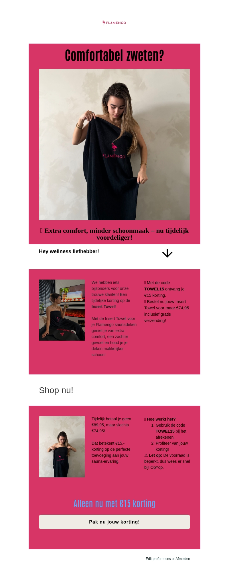 Ontdek de voordelen van de Flamengo Insert Towel! Perfect voor sauna-liefhebbers die van comfort houden. Profiteer nu van een tijdelijke korting van €15 met de code TOWEL15. Houd je handdoek makkelijk schoon en geniet van de zachte textuur. Bestel nu voor slechts €74,95 inclusief gratis verzending.