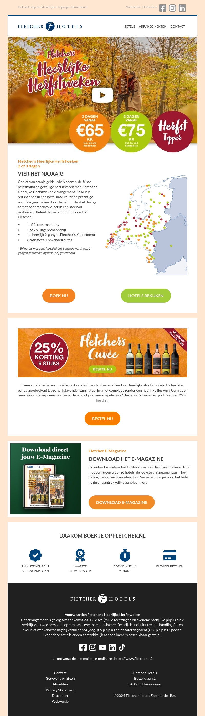 Vier het najaar met Fletcher's Heerlijke Herfstweken. Geniet van een ontspannen verblijf inclusief ontbijt, diner en gratis fiets- en wandelroutes. Profiteer van arrangementen vanaf slechts €65 per persoon. Ontspan in de natuur en eindig je dag met een heerlijke maaltijd in een sfeervol restaurant. Ervaar de herfst in zijn volle glorie bij Fletcher!