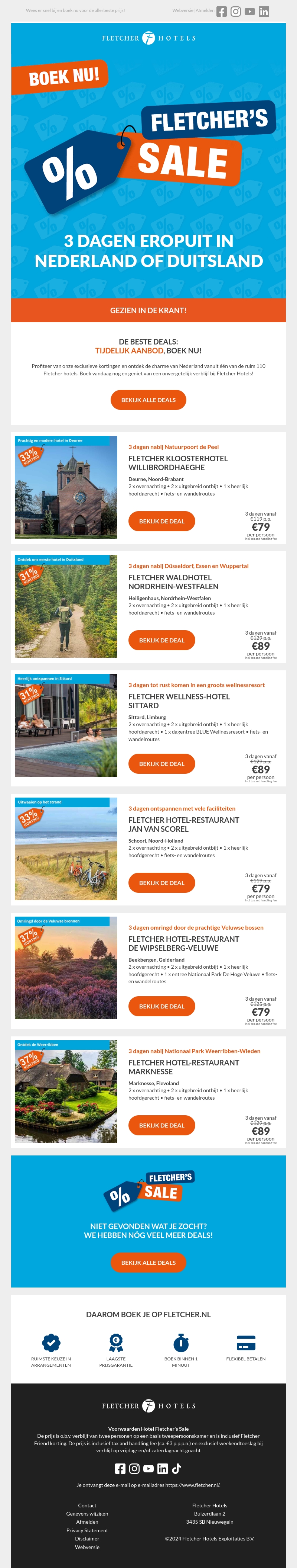 Fletcher Hotels presenteert Fletcher's Sale! Profiteer van exclusieve kortingen en geniet van 3 dagen weg in Nederland of Duitsland. Boek snel en mis het niet - vanaf slechts €79 per persoon.