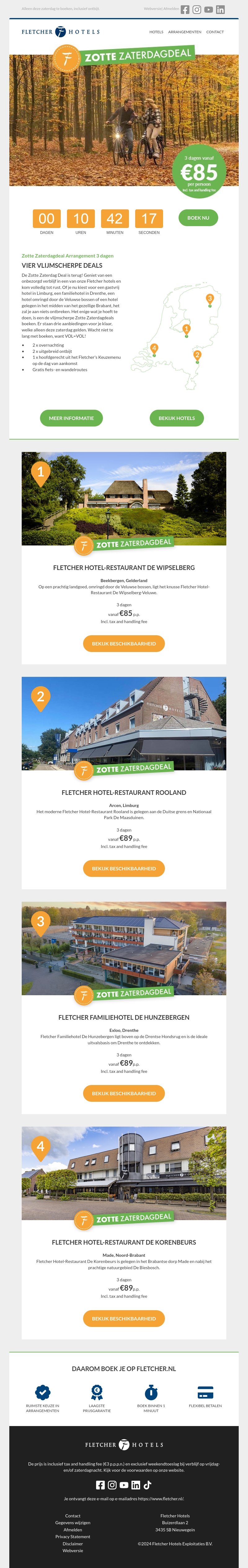 Profiteer van de Zotte Zaterdagdeal en geniet van een 3-daags verblijf bij Fletcher Hotels vanaf slechts €85 per persoon. Bezoek prachtige locaties, zoals de Veluwe, Limburg en Drenthe. Boek nu en mis deze geweldige aanbieding niet!