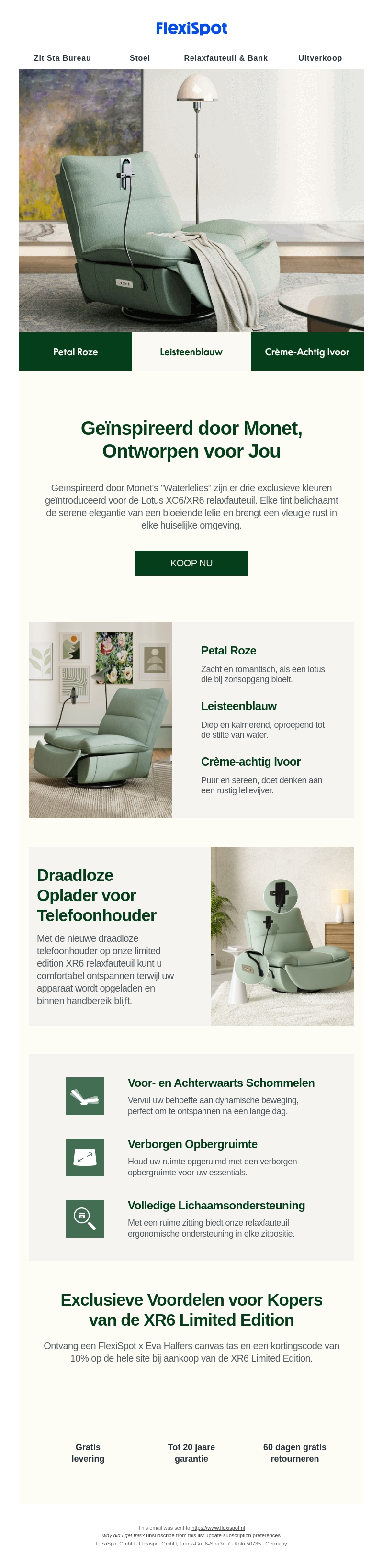 De Monet-geïnspireerde relaxfauteuil van FlexiSpot biedt luxe en comfort in drie prachtige kleuren. Geniet van de draadloze oplader en de ergonomische ondersteuning. Exclusieve voordelen voor de XR6 Limited Edition kopers, inclusief een canvas tas en een kortingscode van 10%.