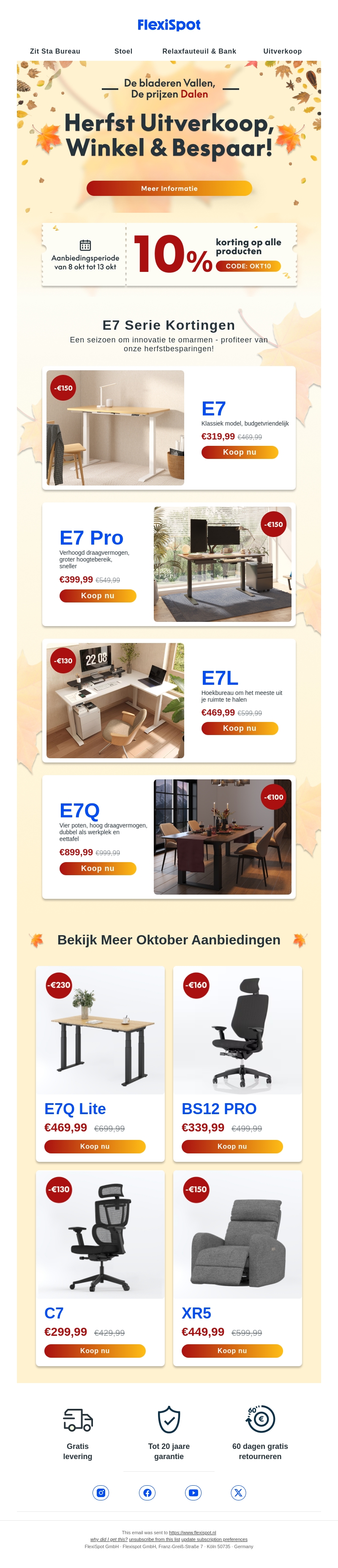 Geniet van scherpe kortingen tijdens de herfstuitverkoop bij FlexiSpot. Van bureaus en stoelen tot relaxfauteuils, er is voor ieder wat wils. De aanbiedingen zijn geldig van 8 oktober tot 13 oktober. Gebruik de speciale kortingscode voor extra prijsverlaging. Mis deze kans niet om te besparen en uw werkruimte te vernieuwen.