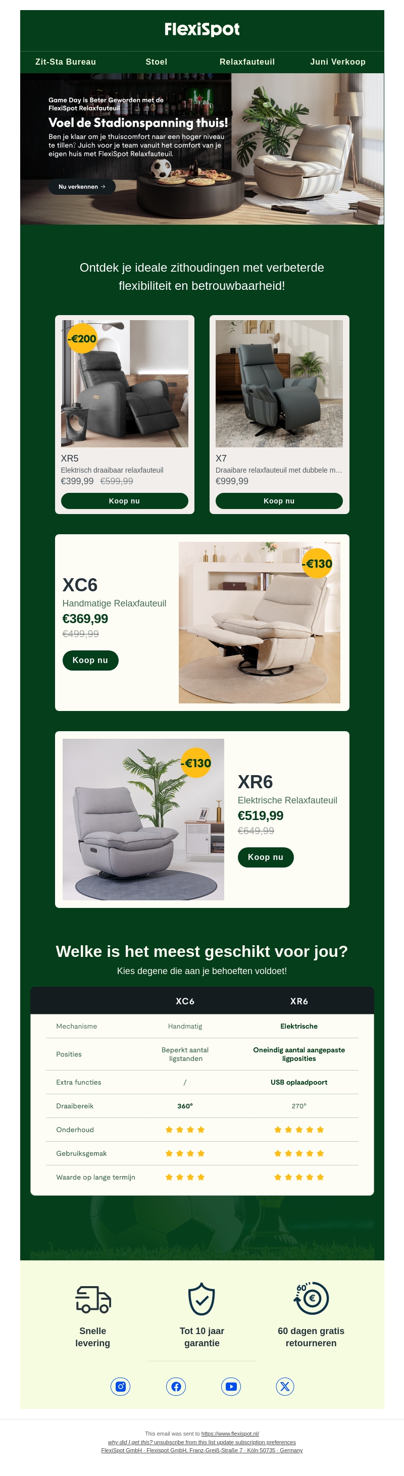 Ontdek het ultieme comfort voor je gamedagen met de FlexiSpot Relaxfauteuil. Of je nu kiest voor de elektrische XR6 of de handmatige XC6, je zit altijd goed. Met verbeterde flexibiliteit en betrouwbaarheid til je je voetbalbeleving naar een hoger niveau. Profiteer nu van de speciale aanbiedingen en kies de fauteuil die bij jou past!