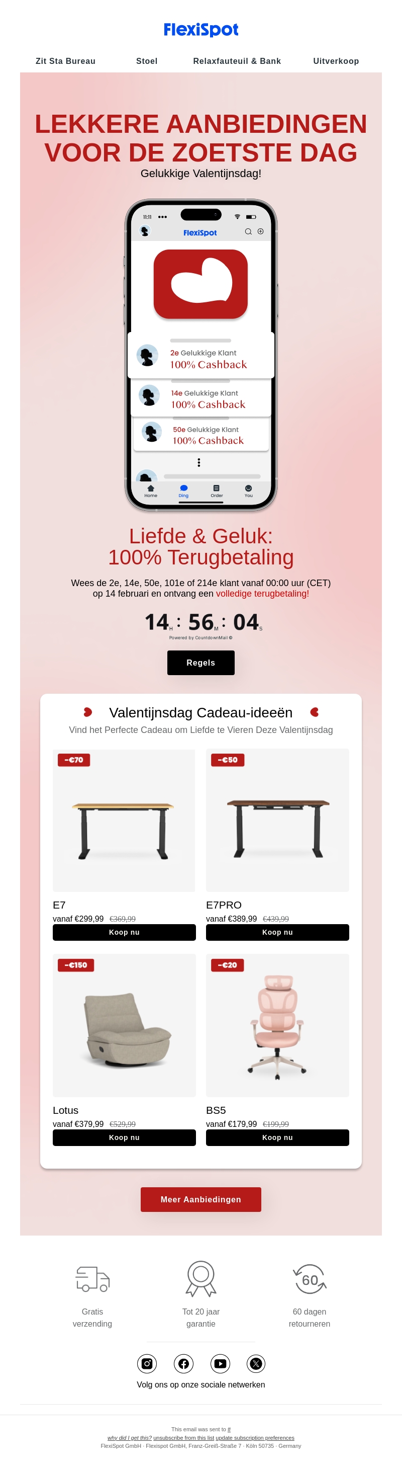 FlexiSpot viert Valentijnsdag met prachtige aanbiedingen en de kans op 100% cashback. Wees een van de gelukkige klanten en profiteer van deze speciale actie. Ontdek stijlvolle bureaus en comfortabele stoelen met grote kortingen. Grijp je kans en maak Valentijnsdag nog specialer met jouw aankoop.