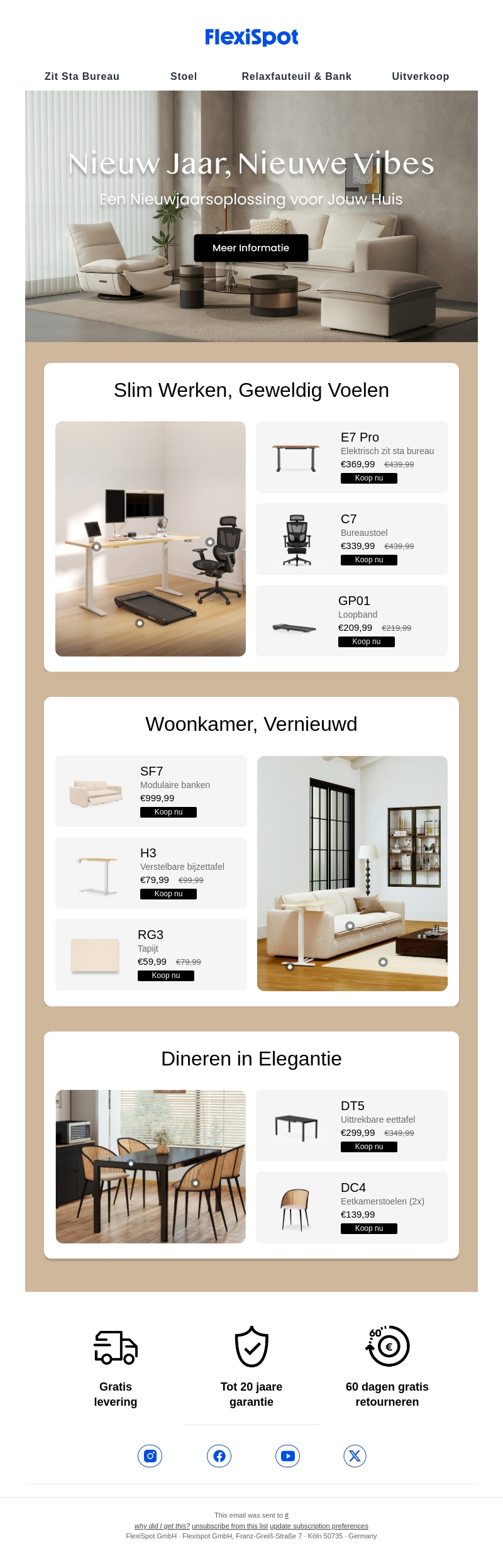 Begin het nieuwe jaar met prachtige meubelaanbiedingen van FlexiSpot. Transformeer je huis met stijl en comfort dankzij onze premium producten. Van zit-sta bureaus en ergonomische stoelen tot modulaire banken en uitschuifbare eettafels. Profiteer van scherpe kortingen en uitstekende garanties. Mis deze kans niet om jouw woonruimte te verfrissen.