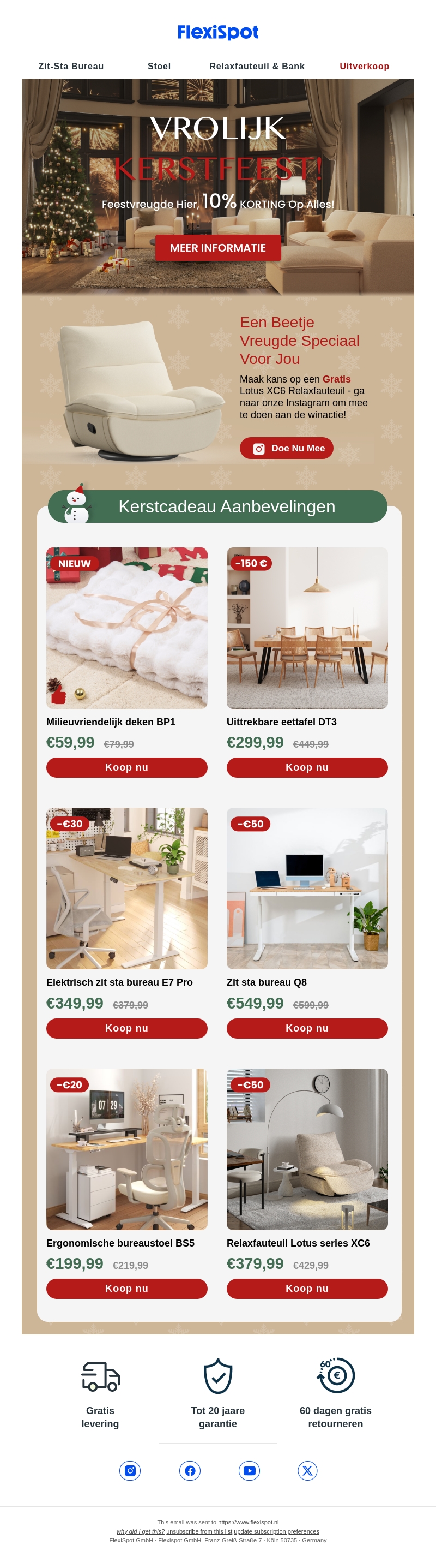 FlexiSpot viert Kerst met een magische aanbieding van 10% korting op alles! Haal het meeste uit de feestdagen met geweldige deals op bureaus, stoelen en fauteuils. Mis het niet en profiteer van gratis levering en 20 jaar garantie. Doe mee aan onze Instagram-wedstrijd voor nog meer verrassingen. Bekijk nu onze cadeau-aanbevelingen!