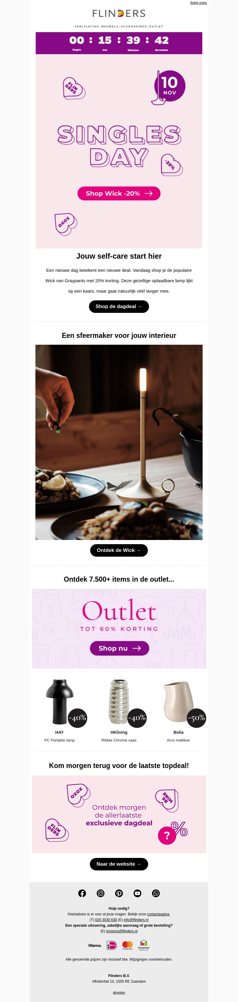 Mis de geweldige dagdeal niet tijdens Singles Day bij Flinders! Ontvang 20% korting op de populaire Wick-lamp van Graypants. Deze sfeervolle lamp lijkt op een kaars, maar gaat veel langer mee. Daarnaast zijn er meer dan 7.500 items met kortingen tot 60% in de outlet. Keer morgen terug voor nog een exclusieve dagdeal!