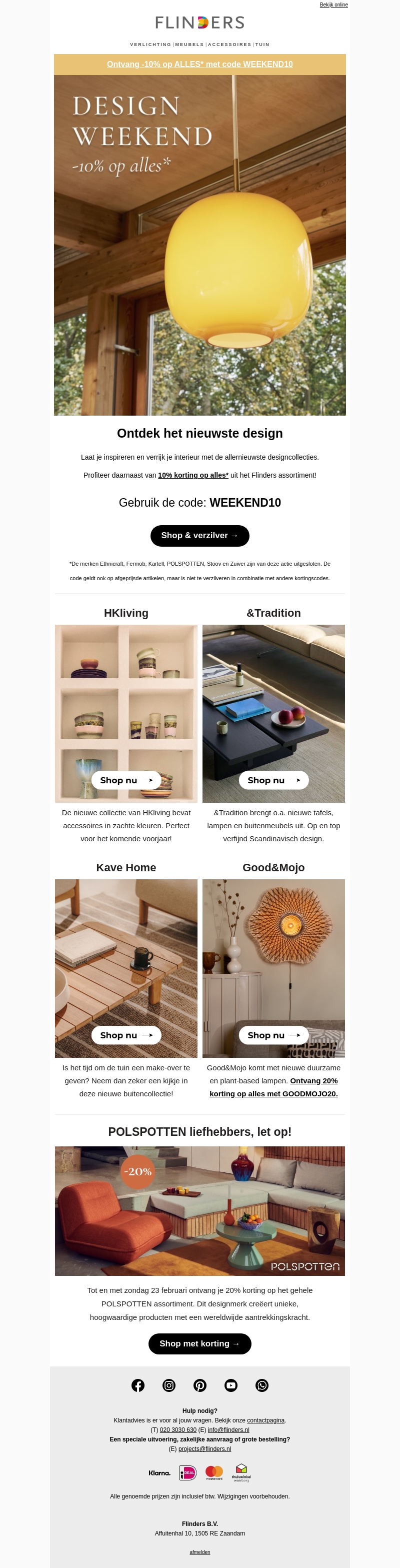 Stap in de wereld van modern design met de nieuwste collecties van HKliving, &Tradition, en meer. Deze nieuwsbrief biedt een exclusieve 10% korting op het gehele Flinders assortiment. Gebruik de code WEEKEND10 om te besparen op jouw favoriete meubels en accessoires. Of je nu gaat voor Scandinavisch verfijning of kleurrijke accessoires, er is voor ieder wat wils. Ontdek dus snel deze brandende aanbiedingen!