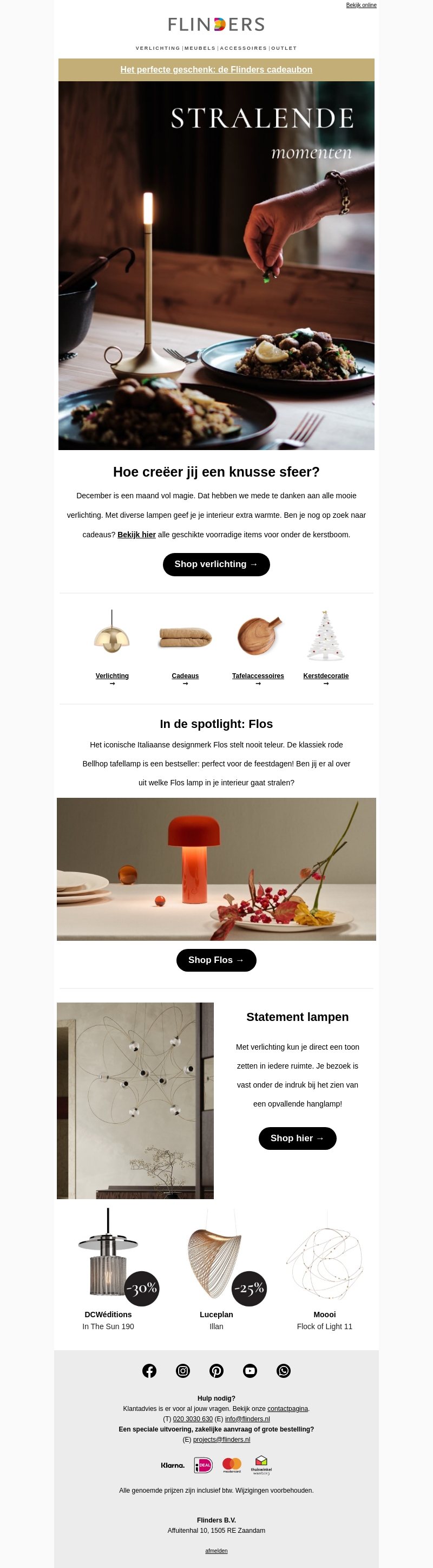 December is dé maand om je huis extra gezellig te maken met prachtige verlichting. Ontdek onze sfeervolle lampen met kortingen tot wel 30%. Of je nu zoekt naar een opvallende hanglamp of een compacte tafellamp, er is voor ieder wat wils. Mis ook de iconische Flos verlichting niet. Bekijk onze voorraadvriendelijke items, perfect als kerstcadeau.