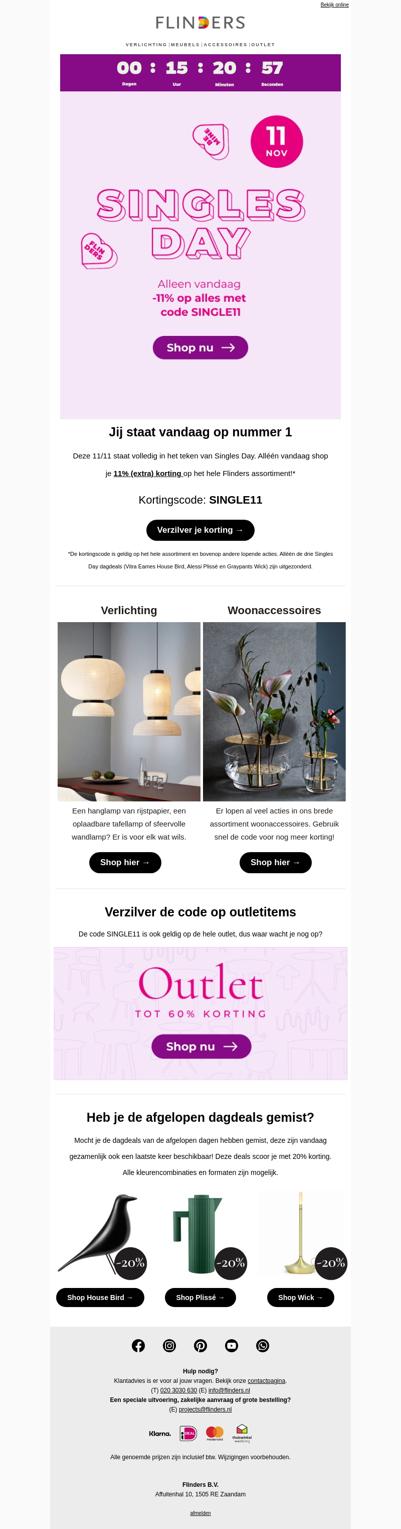 Vier Singles Day met Flinders en geniet van 11% korting op het volledige assortiment. Gebruik de code SINGLE11 om te profiteren van deze exclusieve aanbieding. Dit geldt voor verlichting, woonaccessoires en meer. Mis deze kans niet om je favoriete items met korting te scoren! De kortingscode is alleen geldig op 11 november.