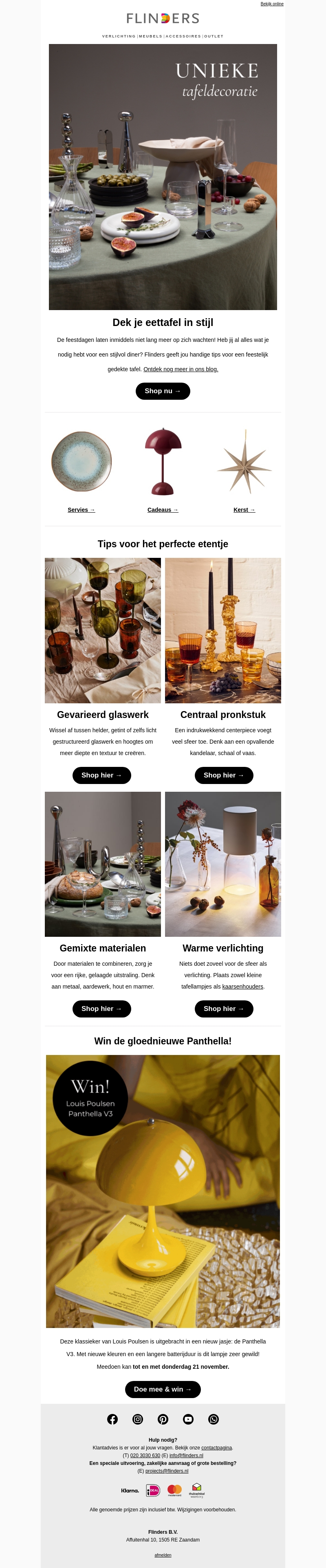 CreΓ«er een schitterende tafelsetting met onze unieke decoratietips. Ontvang advies over gevarieerd glaswerk, pronkstukken, gemixte materialen en warme verlichting. Win de gloednieuwe Panthella-lamp van Louis Poulsen. Met ons advies is jouw tafel klaar voor elk feestelijk diner.