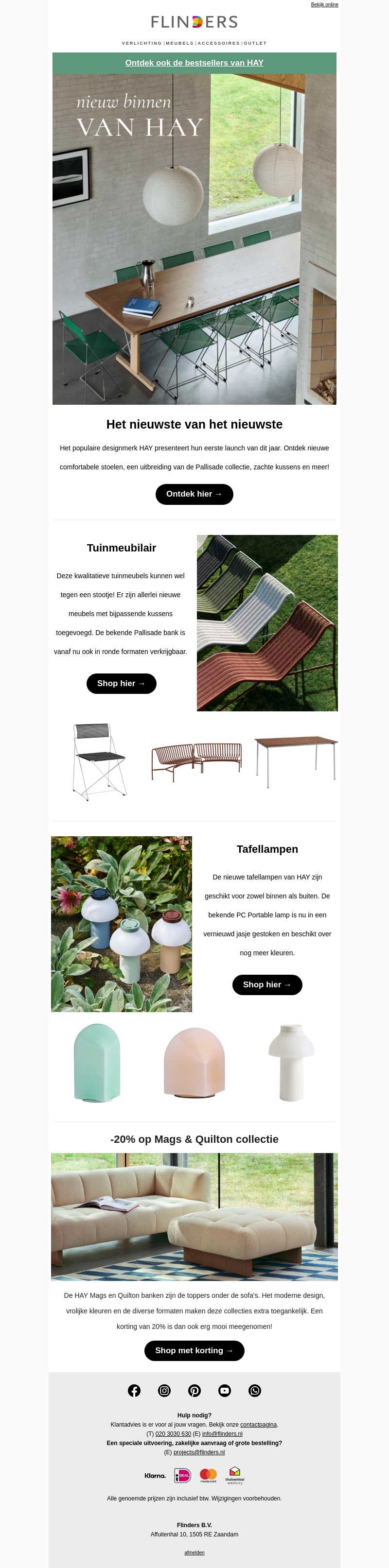 Het populaire designmerk HAY presenteert de nieuwste meubels en accessoires die zowel binnen als buiten perfect passen. Ontdek de innovaties binnen de Palissade collectie en stijlvolle tafellampen. Profiteer nu van 20% korting op de Mags en Quilton banken. Shop de nieuwste designs eenvoudig online.