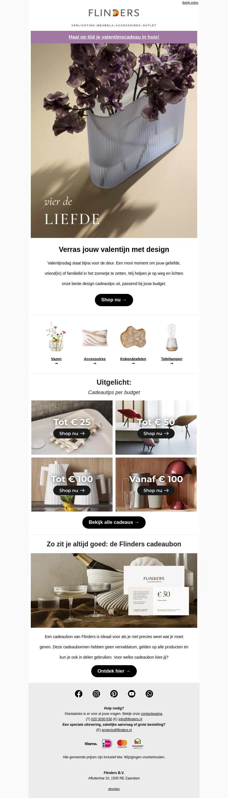 Valentijnsdag nadert snel, en bij Flinders helpen we je de perfecte, stijlvolle geschenken te vinden. Of je nu zoekt naar iets moois voor je geliefde, vriend(in) of familie, wij hebben cadeau-opties voor elke prijsklasse. Van prachtige vazen en accessoires tot koken en tafelen, wij maken het makkelijk om je dierbaren in het zonnetje te zetten. Shop onze gids en vind alles wat je nodig hebt voor een romantische Valentijnsdag.