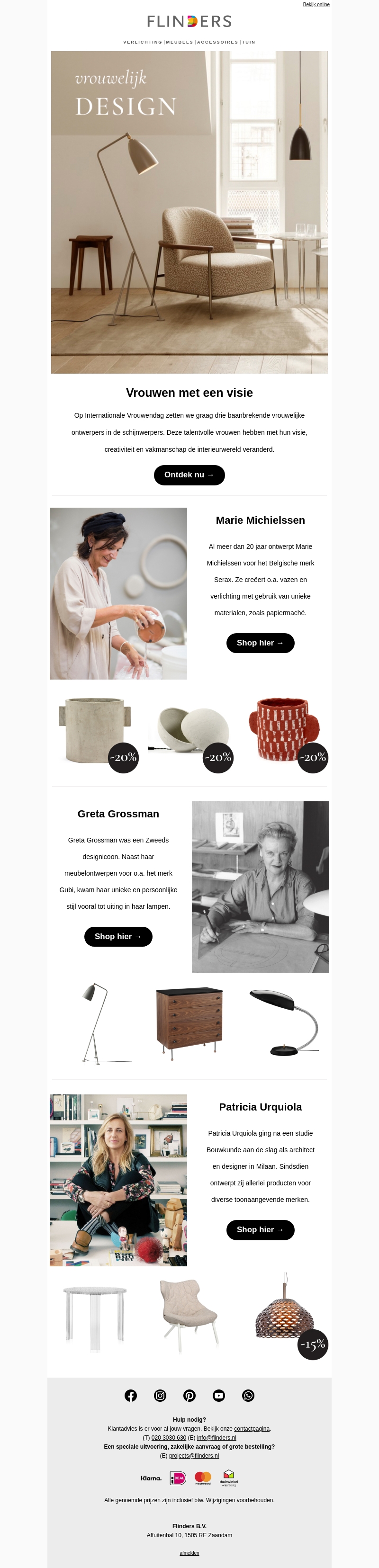 In deze nieuwsbrief vieren we vrouwelijke ontwerpers zoals Marie Michielssen, Greta Grossman en Patricia Urquiola. Ontdek hun iconische designs en verhalen achter de creaties. Vier Internationale Vrouwendag met stijl en design.