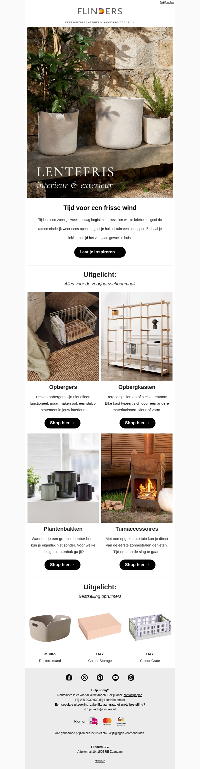 Bereid je huis en tuin voor op het voorjaar met de nieuwste collectie van Flinders. Van stijlvolle opbergers tot handige tuinaccessoires, je vindt alles voor een verfrissende make-over. Kies jouw favoriete plantendecoratie en geniet van een opgeruimd interieur. Laat je inspireren en ontdek hoe je meer ruimte creΓ«ert. Shop nu de beste opbergers van topmerken zoals Muuto en HAY.