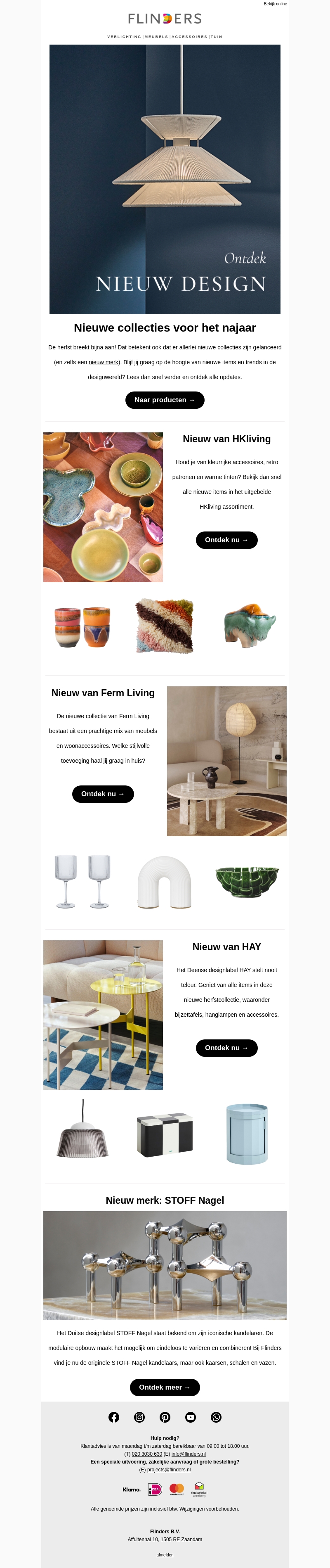 De herfst is aangebroken en dat betekent nieuwe collecties bij Flinders! Bekijk de nieuwste items van HKliving, Ferm Living en HAY. Ontdek kleurrijke accessoires, stijlvolle meubels en unieke designs. Mis ook het nieuwe merk STOFF Nagel niet, bekend om zijn iconische kandelaars.