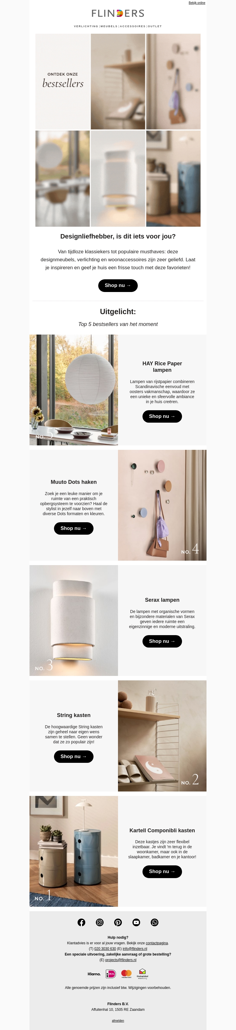 Duik in de wereld van design met onze top 5 bestsellers. Van stijlvolle HAY Rice Paper lampen tot praktische Kartell Componibili kasten, elk stuk voegt een uniek element toe aan je huis. Laat je inspireren door deze zorgvuldig geselecteerde items, van verlichting tot opbergoplossingen. Ontdek de charme van Scandinavisch design en eigentijdse materialen. Bekijk onze selectie en breng een frisse sfeer in je interieur.