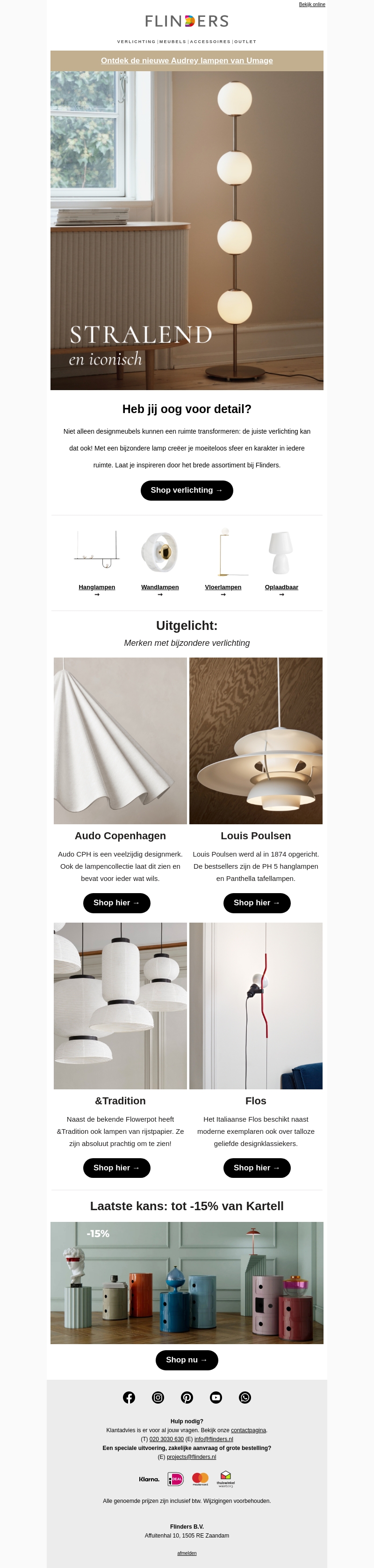 Ontdek een scala aan designverlichting van topmerken zoals Audio Copenhagen, Louis Poulsen, &Tradition, en Flos. CreΓ«er sfeer en karakter in elke ruimte met de juiste lampen. Profiteer nu van de laatste kans op 15% korting op Kartell producten.