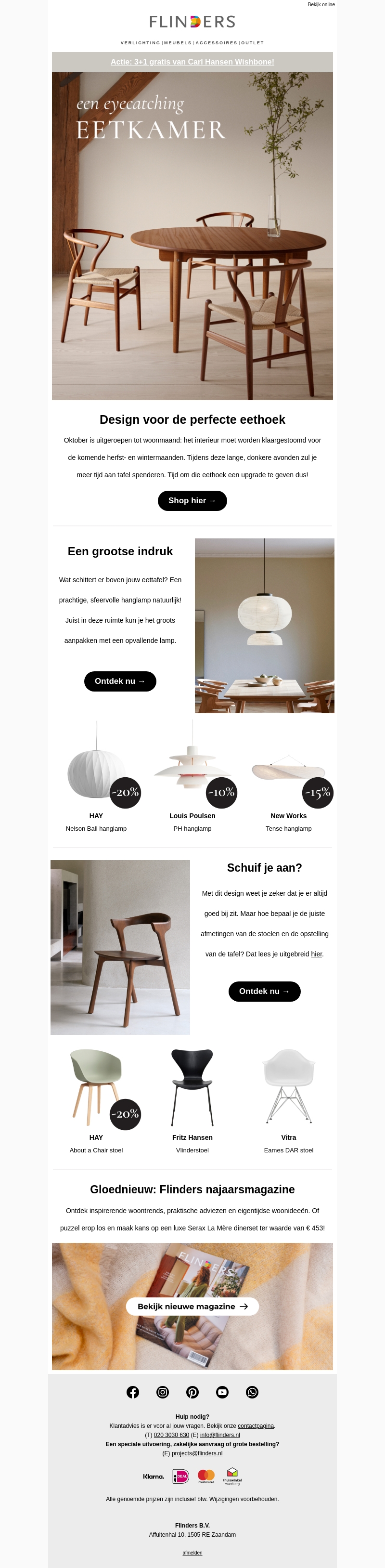Deze oktober woonmaand biedt een prachtige kans om je eethoek een upgrade te geven. Ontdek diverse aanbiedingen op stoelen en lampen van topmerken zoals Carl Hansen, HAY, en Louis Poulsen. Geniet ook van onze exclusieve 3+1 gratis actie op Carl Hansen Wishbone stoelen. Blader door het nieuwe Flinders najaarsmagazine voor inspirerende woonideeën.