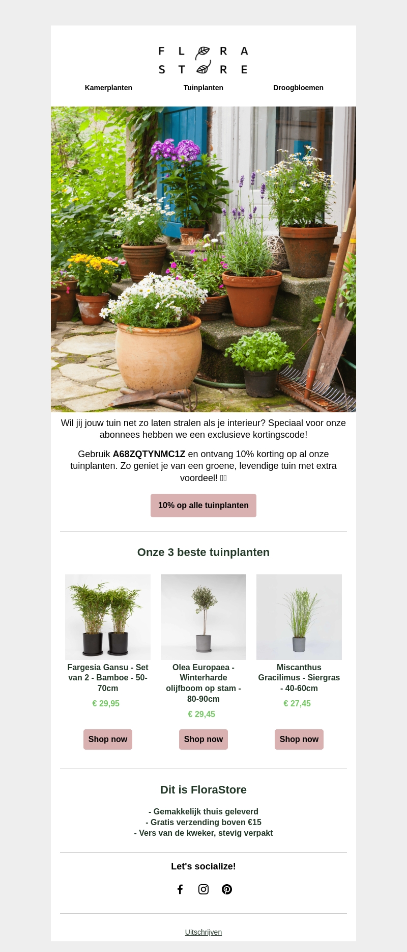 Bij FloraStore ontvang je nu 10% korting op alle tuinplanten. Speciaal voor onze abonnees hebben we een exclusieve kortingscode. Gebruik de code en geniet van een groenere tuin. Bekijk onze top 3 tuinplanten en voeg ze toe aan je collectie. Verschillende planten gemakkelijk thuis geleverd!