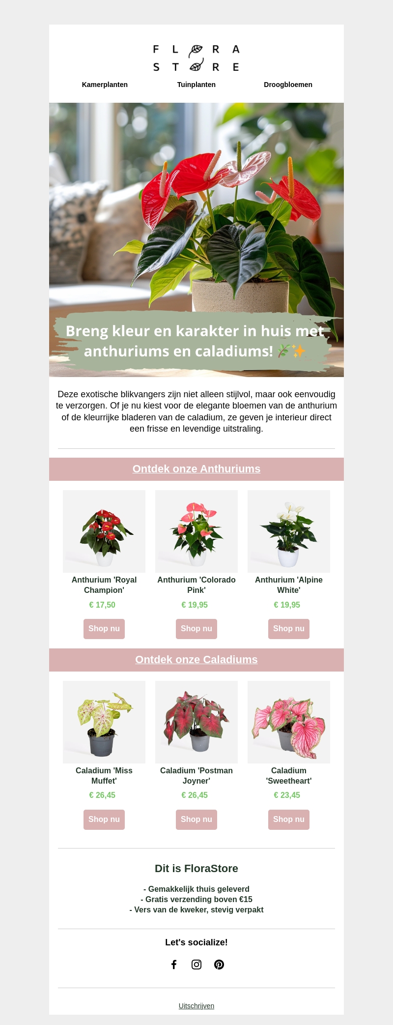 Breng kleur en karakter in huis met onze exotische anthuriums en caladiums! Deze stijlvolle blikvangers zijn eenvoudig te verzorgen en geven je interieur direct een frisse uitstraling. Bekijk ons aanbod en kies je favoriete plant met gratis verzending boven β¬15.