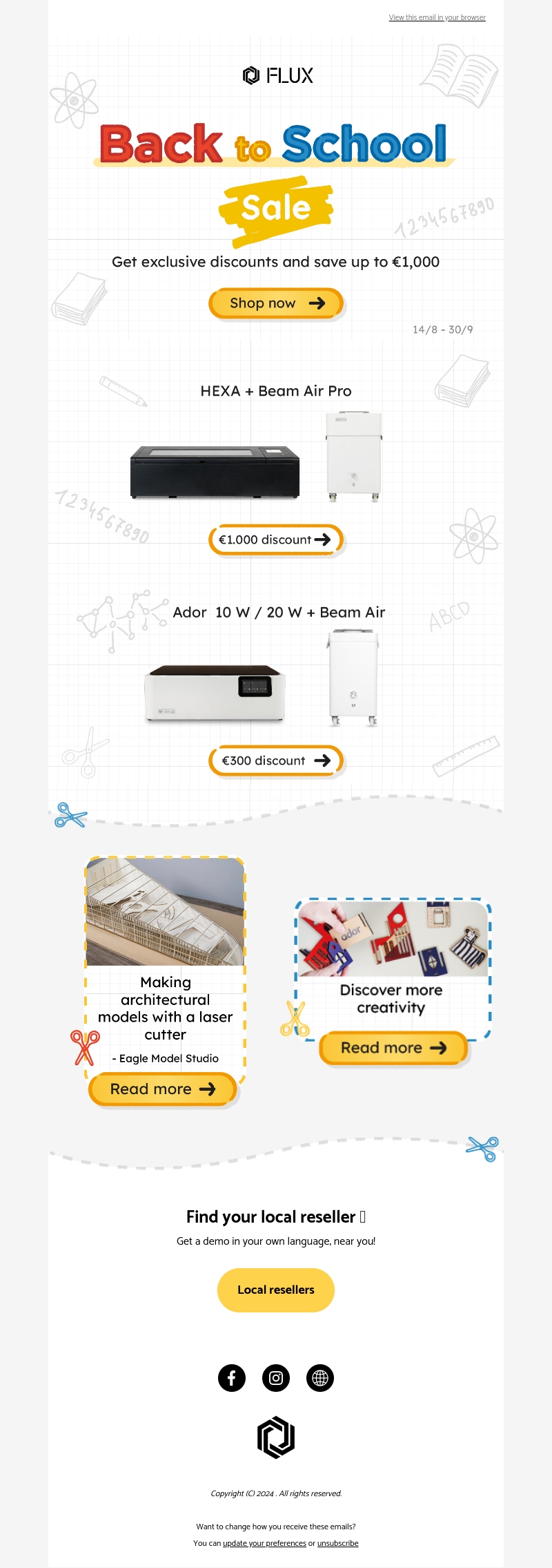Bereid je klaslokaal voor op het nieuwe schooljaar met onze Back to School Sale! Ontvang tot β¬1.000 korting op HEXA + Beam Air Pro en β¬300 korting op Ador 10W/20W + Beam Air. CreΓ«er creatieve en educatieve modellen met gemak.