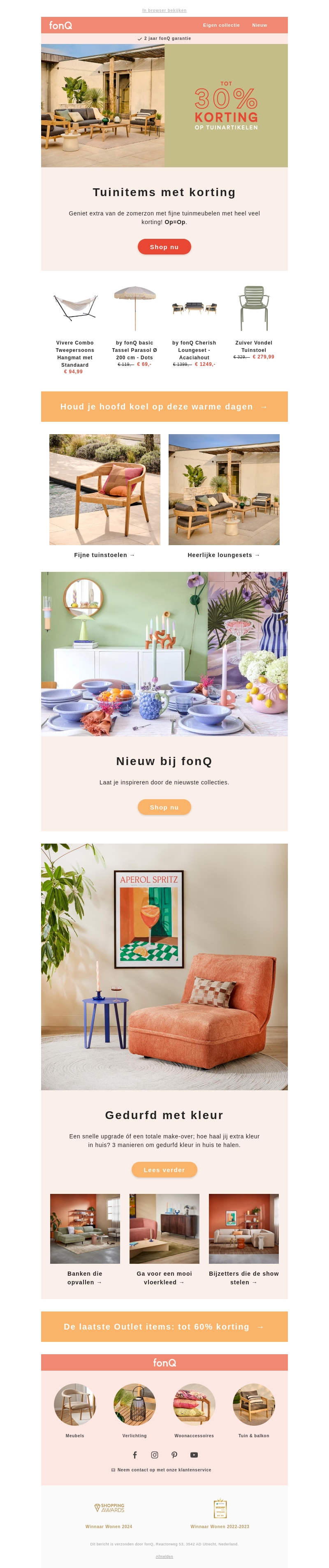 Deze zomer geniet je extra met onze geweldige kortingen op tuinartikelen. Profiteer van kortingen tot wel 30%! Bekijk de nieuwste collecties meubels en woonaccessoires bij fonQ. Mis de outlet aanbiedingen niet, met kortingen tot 60%.