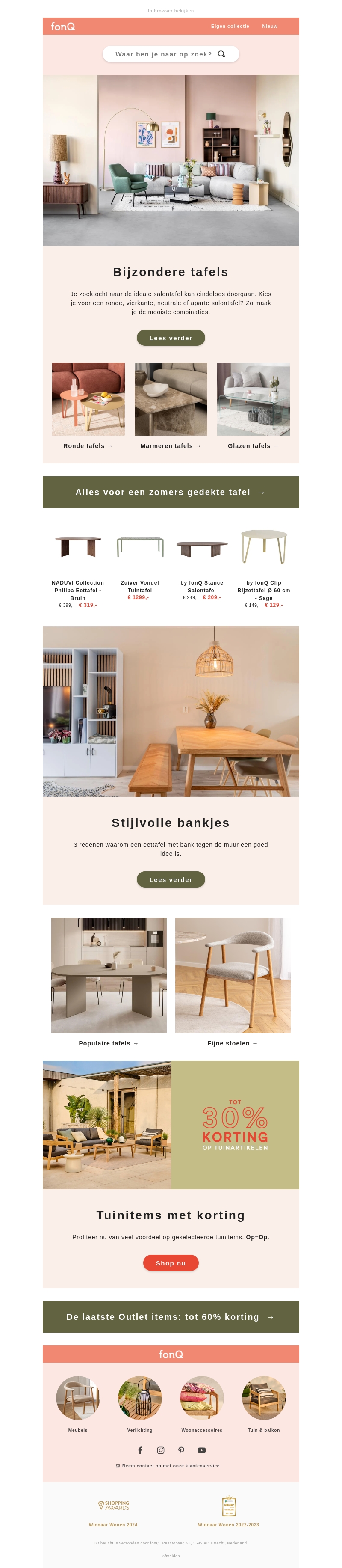 Je zoektocht naar de ideale tafel eindigt hier! Of je nu op zoek bent naar een ronde, marmeren of glazen tafel, bij fonQ vind je het allemaal. Daarnaast hebben we stijlvolle bankjes en tuinartikelen met kortingen tot wel 30%. Mis deze kans niet en bekijk ons nieuwste aanbod!