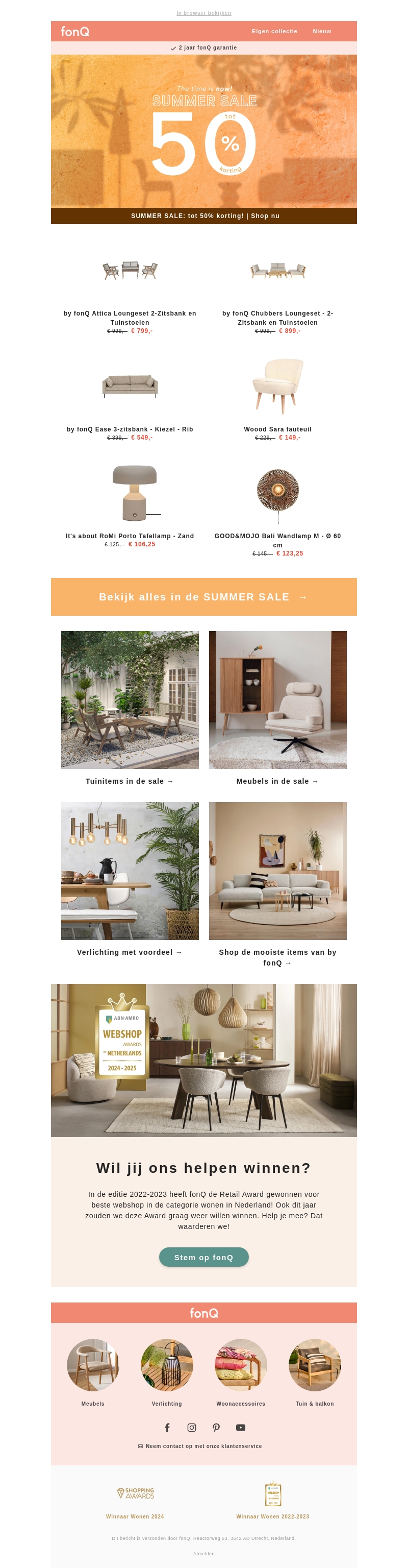De Summer Sale bij fonQ is begonnen! Ontdek nu geweldige deals met kortingen tot 50% op een breed scala aan producten. Van stijlvolle loungesets en fauteuils tot trendy tafellampen en wandlampen, je vindt het allemaal bij fonQ. Sla je slag en shop je favoriete items tegen scherpe prijzen deze zomer.