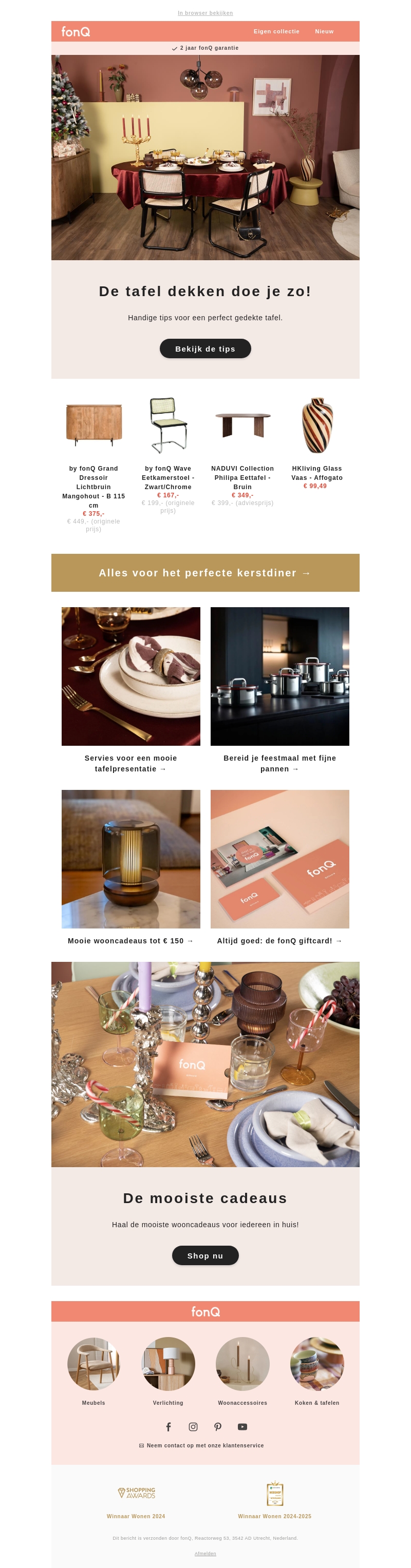 Leer hoe je de perfecte tafelsetting creΓ«ert voor je Kerstdiner met producten van fonQ. Van tafeldecoraties tot stijlvolle meubels, alles wat je nodig hebt voor een feestelijke avond vind je hier. Ontdek ook onze speciale kerstcadeaus en fonQ giftcard voor een ideaal presentje.