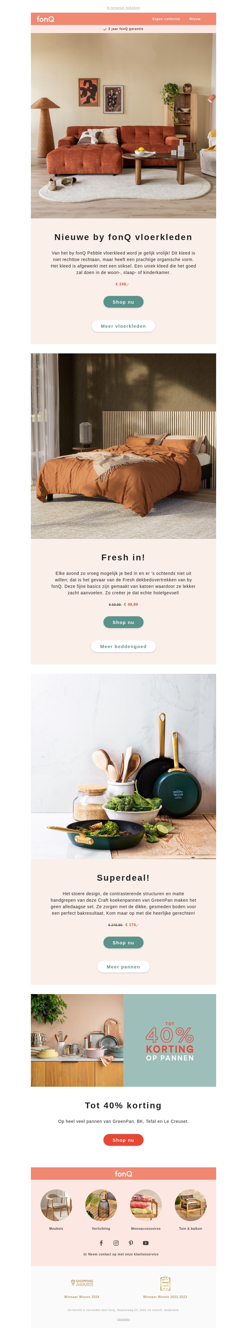 In deze nieuwsbrief van fonQ worden de nieuwste vloer- en beddengoed collecties gepresenteerd. Ontdek de stijlvolle fonQ Pebble vloerkleden, de comfortabele Fresh dekbedovertrekken en de geweldige deals op kookpannen.