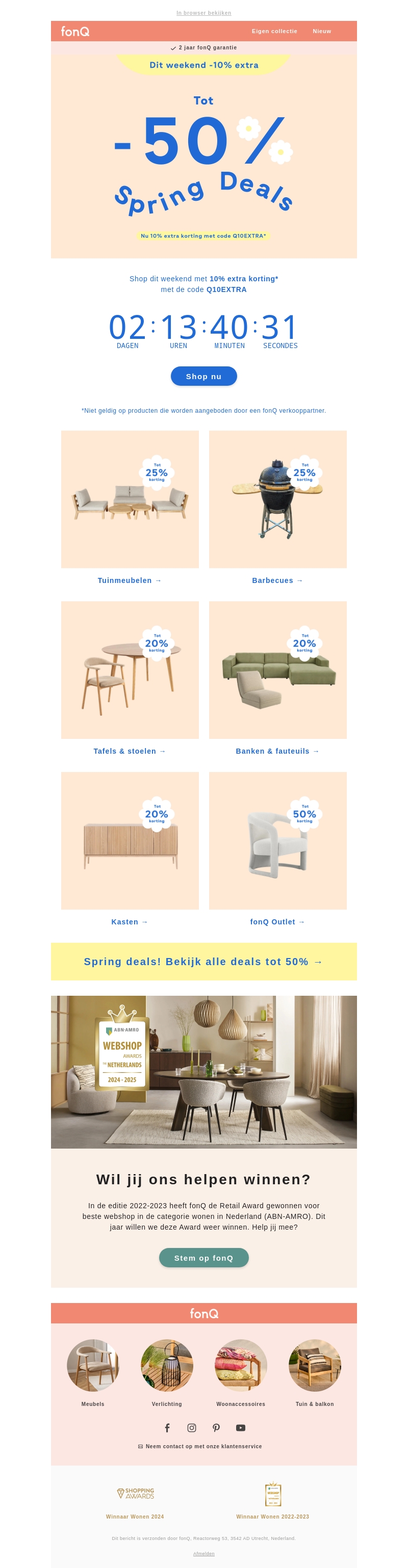 Profiteer dit weekend van fantastische kortingen bij fonQ. Ontvang tot wel 50% korting op onze Spring Deals en geniet van een extra 10% korting met de code Q10EXTRA. Snel shoppen want de tijd tikt door!