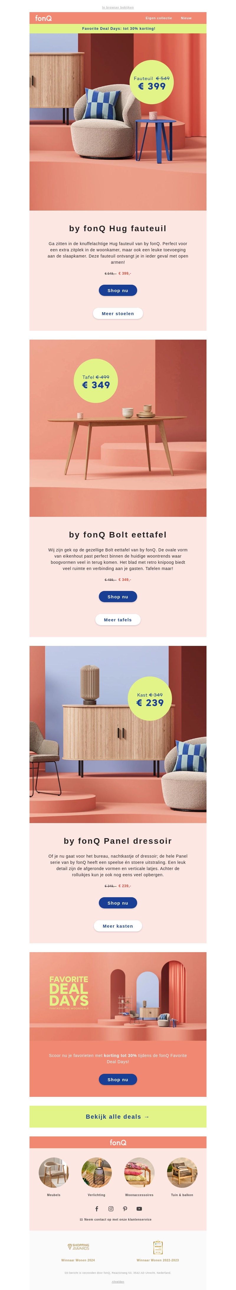 Mis de Favorite Deal Days bij fonQ niet! Profiteer van kortingen tot 50% op diverse meubels zoals fauteuils, eettafels en dresssoirs. Haal stijlvolle en functionele items in huis en maak je interieur helemaal af. Bekijk de deals nu en profiteer van deze geweldige aanbiedingen!