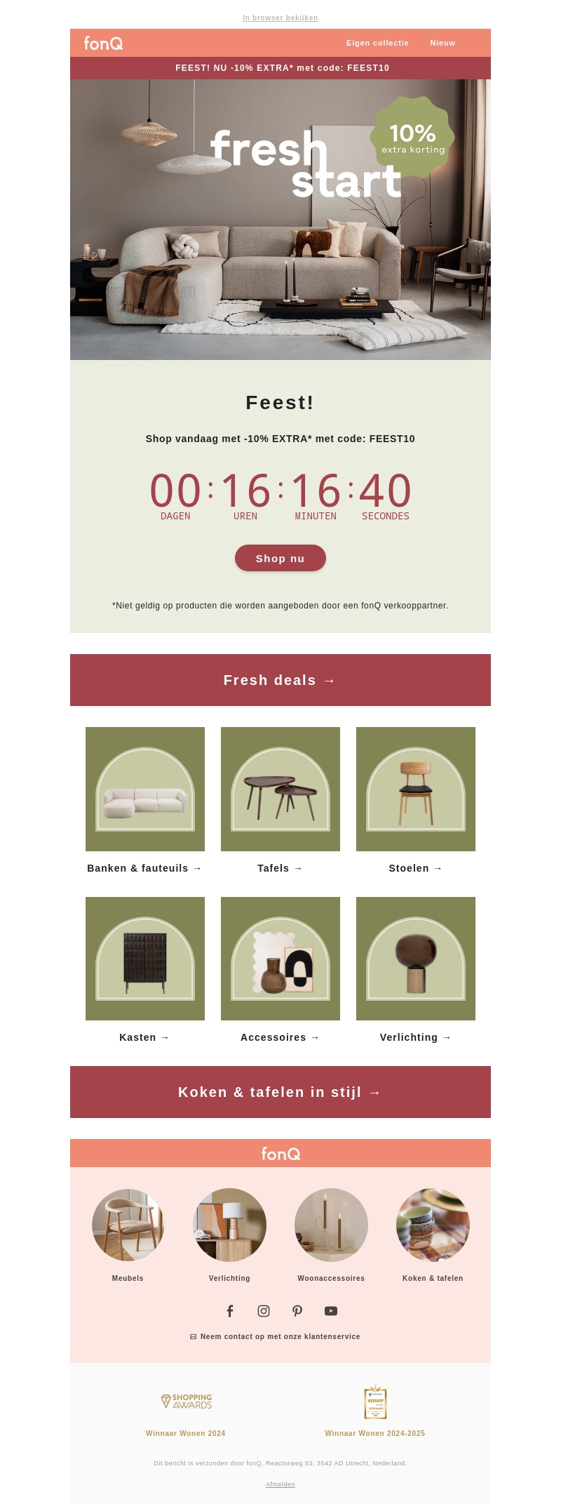 Het is feest bij fonQ! Geniet nu van een extra korting van 10% op onze prachtige meubelcollecties en accessoires. Gebruik de kortingscode FEEST10 en sla snel je slag. Of je nu op zoek bent naar een nieuwe bank, tafels, stoelen, of accessoires, bij fonQ vind je het allemaal. Vergeet niet om binnen de aangegeven tijd te winkelen om je korting te verzilveren. Mis het niet!