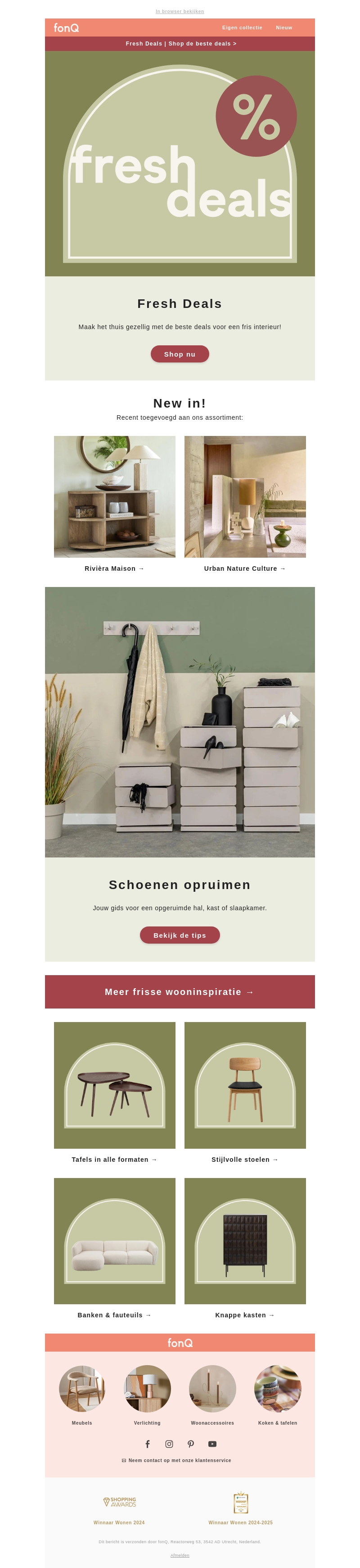 FonQ presenteert zijn nieuwste 'Fresh Deals' voor een stijlvol interieur. Maak kennis met recente toevoegingen zoals Riviera Maison en Urban Nature Culture. Vind de beste tips voor het organiseren van je schoenen en meer inspiratie voor meubels. Bezoek FonQ voor nieuwe tafels, stoelen, banken en kasten!