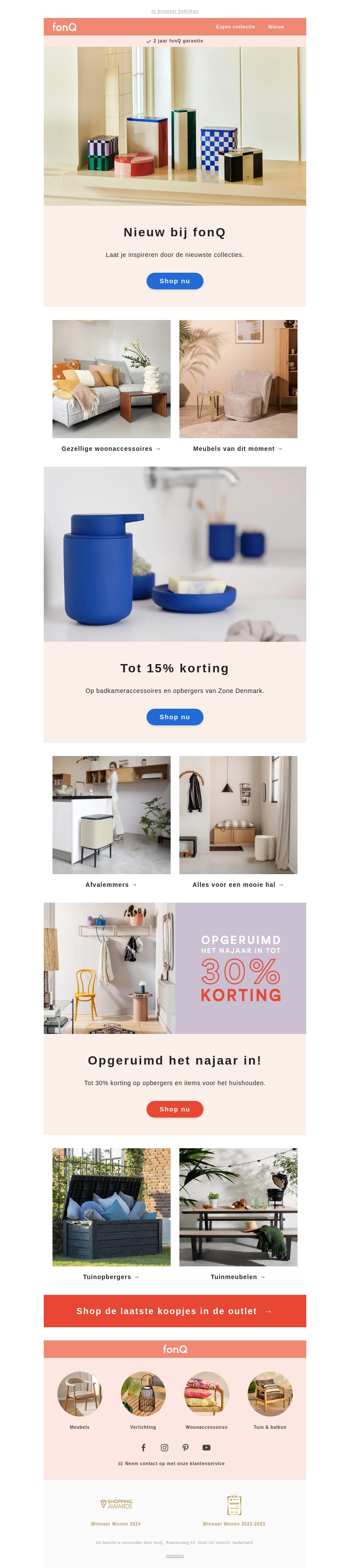 Verken de nieuwste collecties bij fonQ. Ontdek trendy woonaccessoires en meubelen met kortingen tot 30%. Shop nu en geef je interieur een frisse look met onze hoogstaande producten. Speciale aanbieding voor badkameraccessoires van Zone Denmark met 15% korting. Mis het niet om je huis opgeruimd het najaar in te gaan met onze kortingsacties.