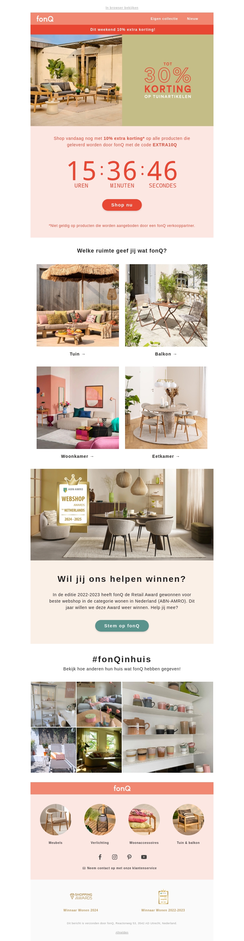 Ontvang vandaag nog 10% extra korting op alle producten bij fonQ met de code EXTRA10Q. Mis deze kans niet om uw buitenruimte te verfraaien met onze hoogwaardige tuinartikelen. Bekijk ook hoe andere klanten hun huis hebben ingericht met fonQ in #fonQinhuis. Stem op fonQ en help ons de Retail Award te winnen!