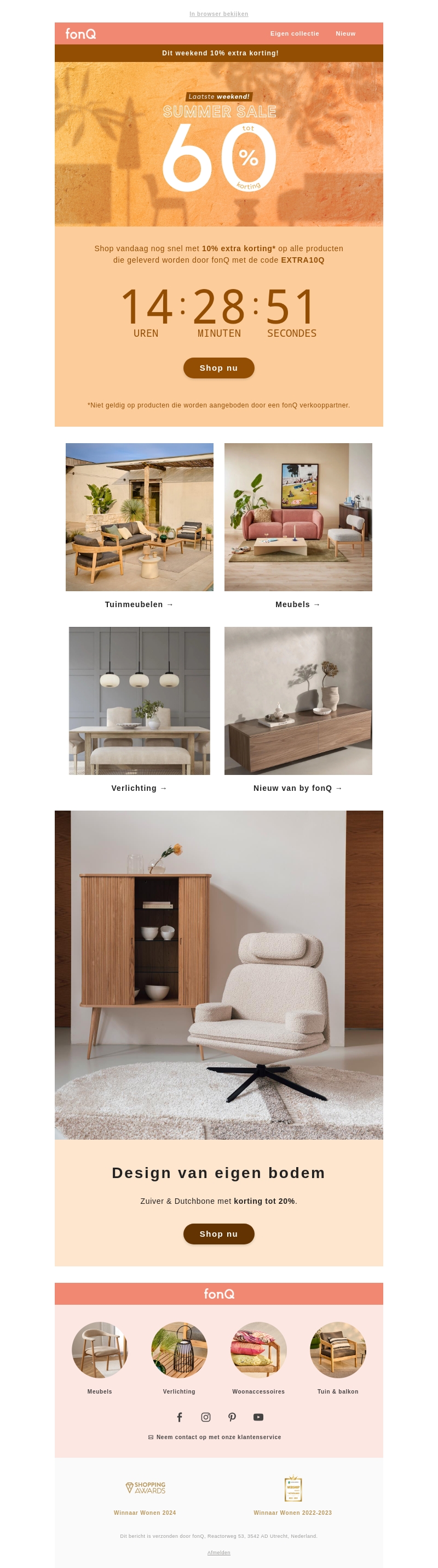 Het is het laatste weekend om 10% extra korting te krijgen op alle producten bij fonQ. Gebruik de code EXTRA10Q bij het afrekenen. Bezoek onze website voor een breed assortiment aan tuinmeubelen, meubels, verlichting en onze nieuwe collectie van by fonQ. Mis deze kans niet!