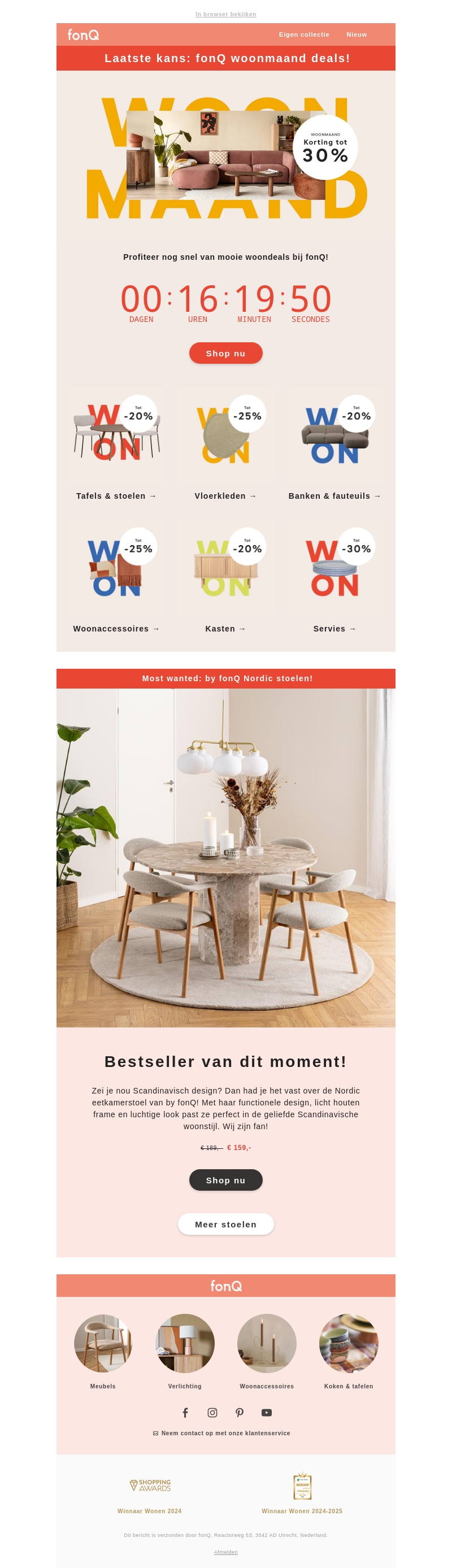 Mis de laatste kans niet om te profiteren van fonQ's woonmaand deals! Ontvang tot 30% korting op diverse categorieΓ«n, zoals banken, stoelen, woonaccessoires en meer. De populaire Nordic eetkamerstoel, met zijn Scandinavische design, is nu ook afgeprijsd. Haast je en shop voor de tijd om is!