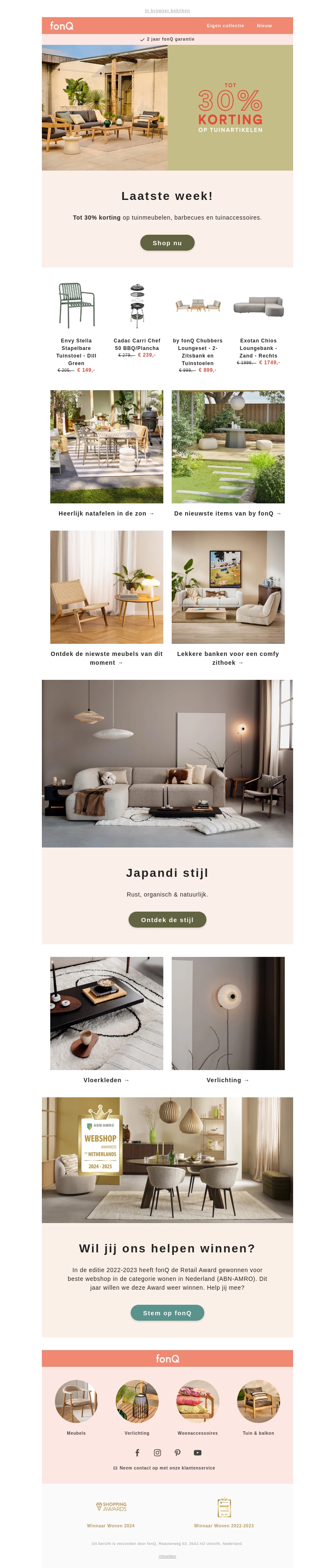 Deze week is het de laatste kans om te profiteren van geweldige kortingen bij fonQ! Ontvang tot 30% korting op diverse tuinmeubelen, barbecues en tuinaccessoires. Maak jouw tuin zomer-klaar met de nieuwste items van fonQ. Bekijk ook onze Japandi-stijl voor een rustgevende en natuurlijke uitstraling in huis.