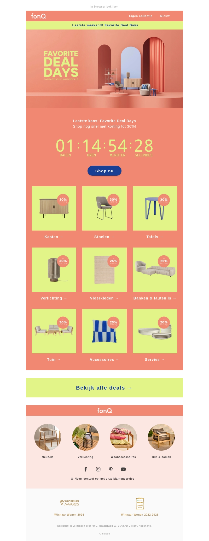 Mis deze unieke kans niet tijdens de FonQ Favoriete Deal Dagen! Sla je slag met kortingen tot wel 30% op meubels, verlichting, vloerkleden, tuinmeubelen en nog veel meer. Deze aanbiedingen zijn slechts voor een beperkte tijd beschikbaar. Shop nu voordat het te laat is. Klik op 'Shop nu' en ontdek alle deals.