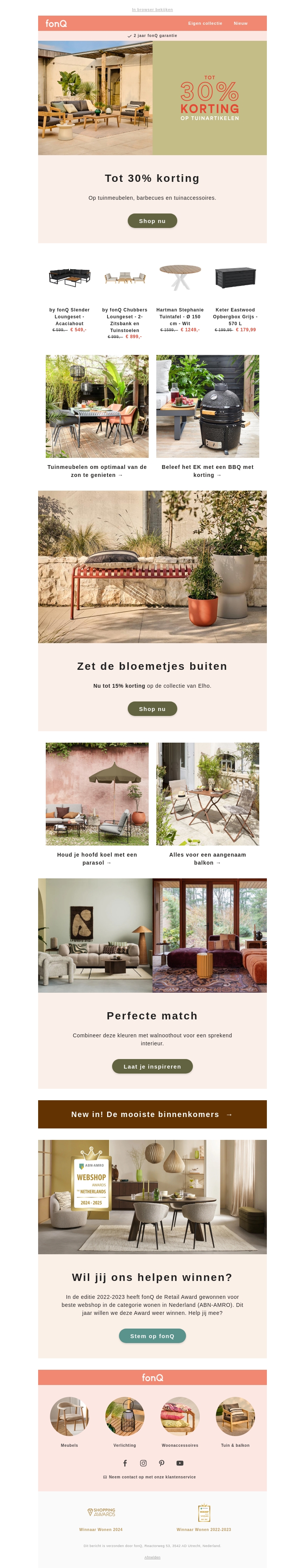 Geniet van geweldige kortingen tot 30% op tuinmeubelen, barbecues en meer bij fonQ. Ontdek de nieuwste collectie tuinartikelen en zorg ervoor dat uw buitenruimte er perfect uitziet voor het zomerseizoen. Koop nu en bespaar op hoogwaardige tuininrichting!