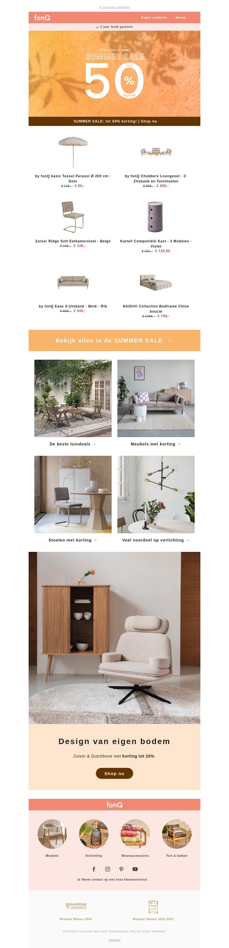 Beleef de zomer met fantastische aanbiedingen in de Summer Sale van fonQ. Ontvang kortingen tot 50% op een brede selectie producten, van meubels tot tuinaccessoires. Mis deze kans niet om je huis en tuin voordelig in te richten met kwalitatieve items van topmerken.