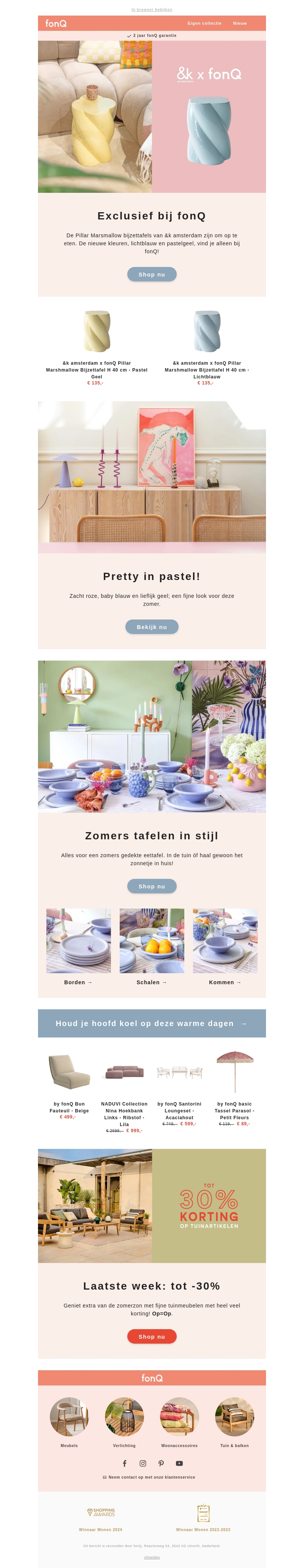 Exclusief bij fonQ vind je de nieuwste collectie in zachte pasteltinten. CreΓ«er een zomerlook met zomers tafeldecor en profiteer van kortingen tot 30% op tuinartikelen. Laat je inspireren door de nieuwste designs en aanbiedingen!