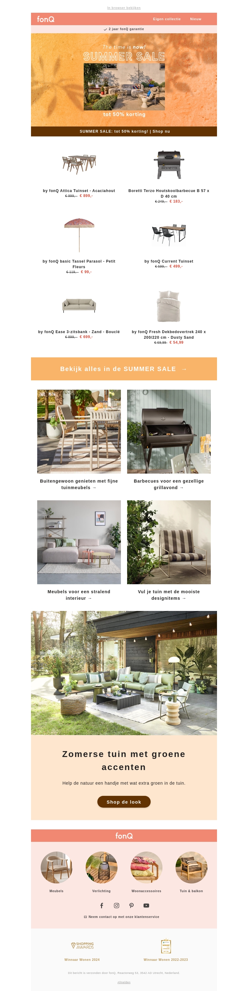 De Summer Sale bij fonQ is begonnen! Ontdek zomerse deals met kortingen tot 50% op een breed scala aan producten. Van stijlvolle tuinsets en barbecues tot zonnige parasols en comfortabele meubels. Shop nu en bereid je voor op een geweldige zomer!