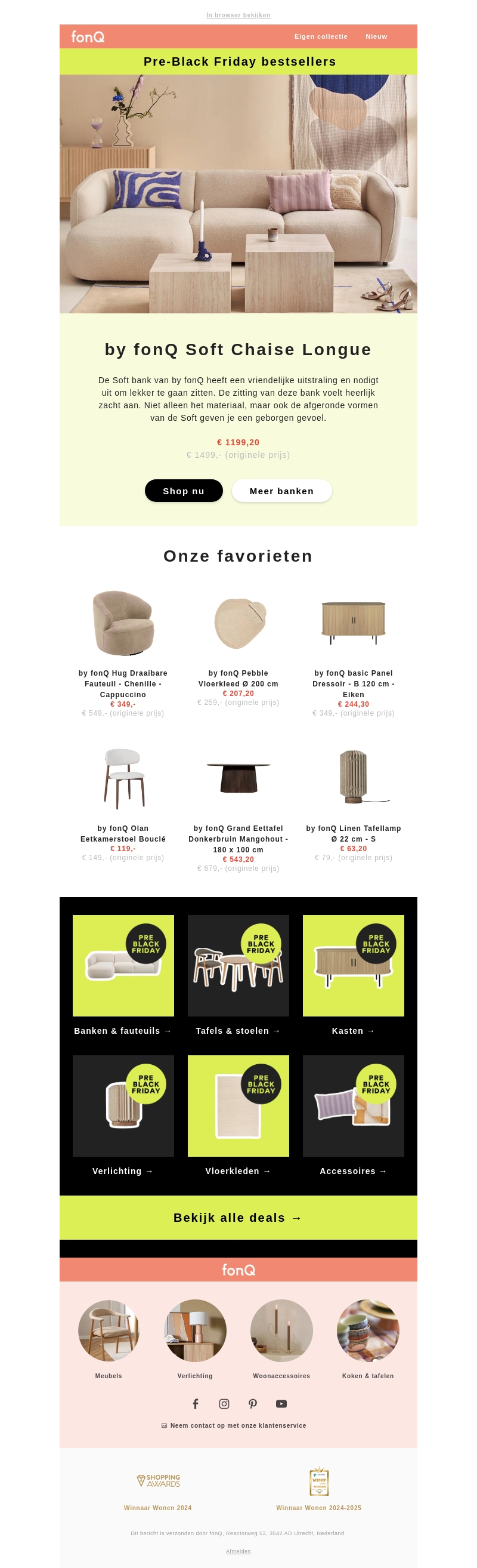 De Pre-Black Friday collectie van fonQ biedt een selectie van populaire meubelstukken en accessoires tegen aantrekkelijke prijzen. Van stijlvolle banken tot elegante tafellampen, er is voor ieder wat wils. Profiteer van kortingen op designklassiekers en creΓ«er een inspirerende leefruimte. Ontdek fonQ's favorieten en bereid je huis voor op het nieuwe seizoen.