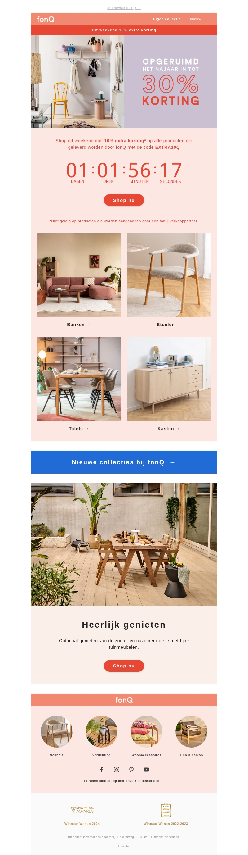 Dit weekend biedt fonQ een speciale aanbieding met 10% extra korting op alle producten die geleverd worden door fonQ. Gebruik de couponcode EXTRA10Q om van deze aanbieding te profiteren. Geldig voor een beperkte tijd, dus mis het niet. Shop nu voor banken, stoelen, tafels en kasten.