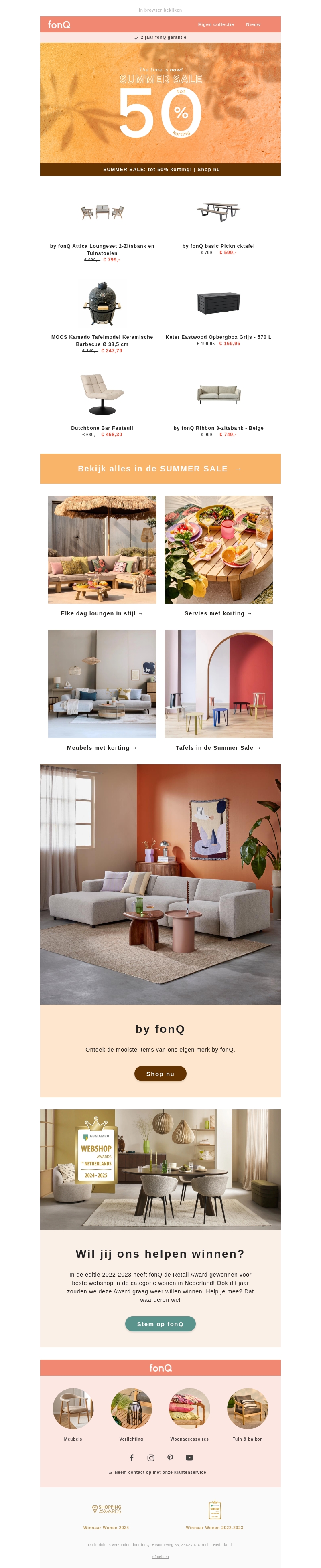 Profiteer van de spectaculaire zomersale bij fonQ en bespaar tot wel 50% op een breed scala aan producten. Van loungebanken en picknicktafels tot barbecue en opbergboxen, er is voor ieder wat wils. Mis deze kans niet en bekijk de volledige sale nu!