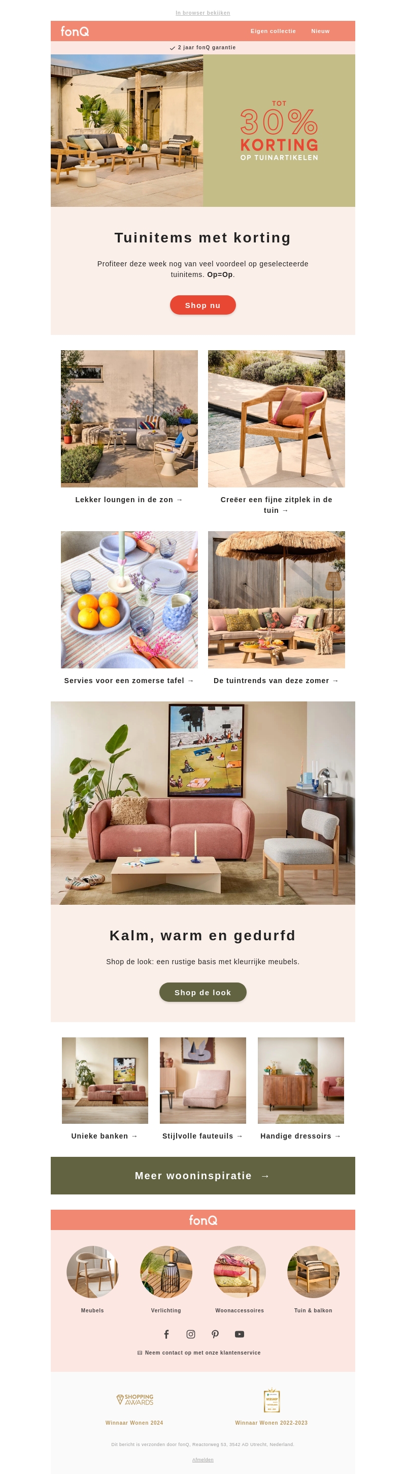 Pak nu je voordeel met tot wel 30% korting op geselecteerde tuinitems bij fonQ. Van loungemeubelen tot stijlvolle accessoires, maak je tuin helemaal klaar voor de zomer. Wees er snel bij, op=op!