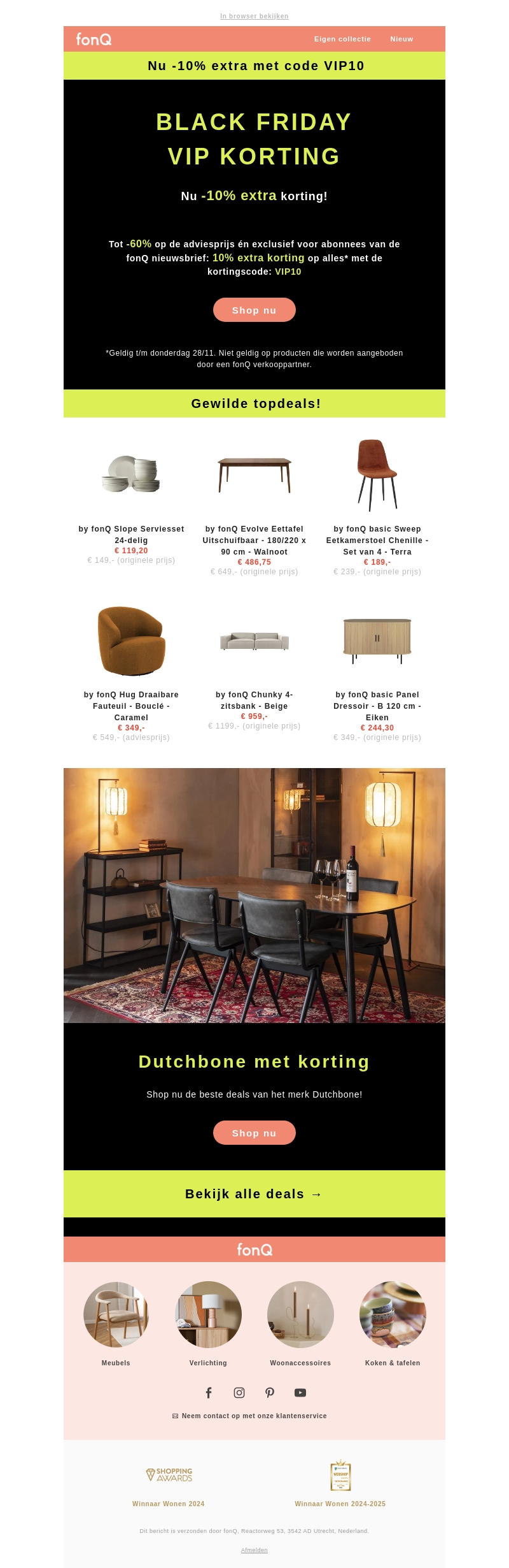 Profiteer van ons exclusieve VIP voordeel met 10% extra korting op geselecteerde producten. Deze aanbieding is speciaal voor nieuwsbriefabonnees. Beperkt geldig tot 28/11. Ontdek geweldige deals op meubels, verlichting en woonaccessoires. Mis deze kans niet en shop nu bij fonQ!